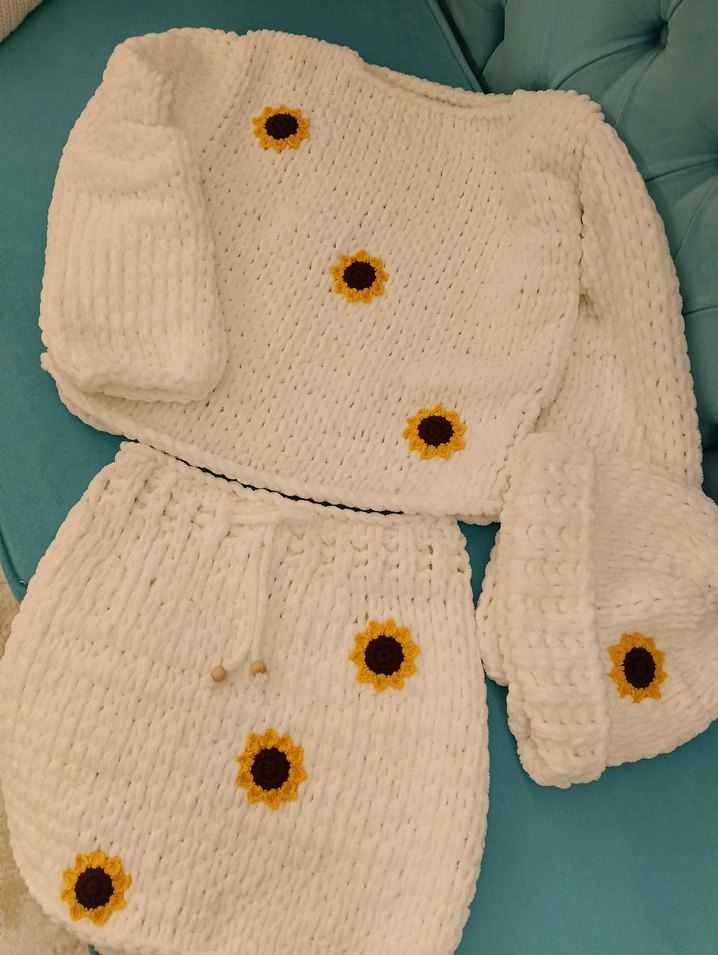 Uzun kollu, beyaz örgü kız takımı, ayçiçeği detaylarıyla yumuşak ve rahat bir his sunar.