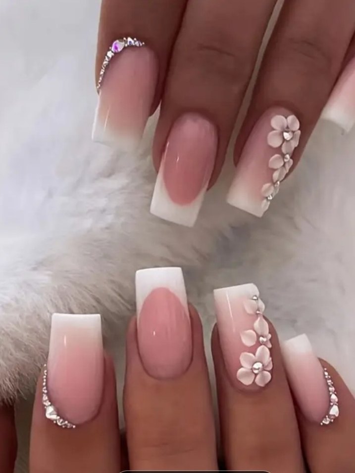 Beyaz pastel renkte, çiçek detaylı ve taş süslemeli zarif tırnak süsü.