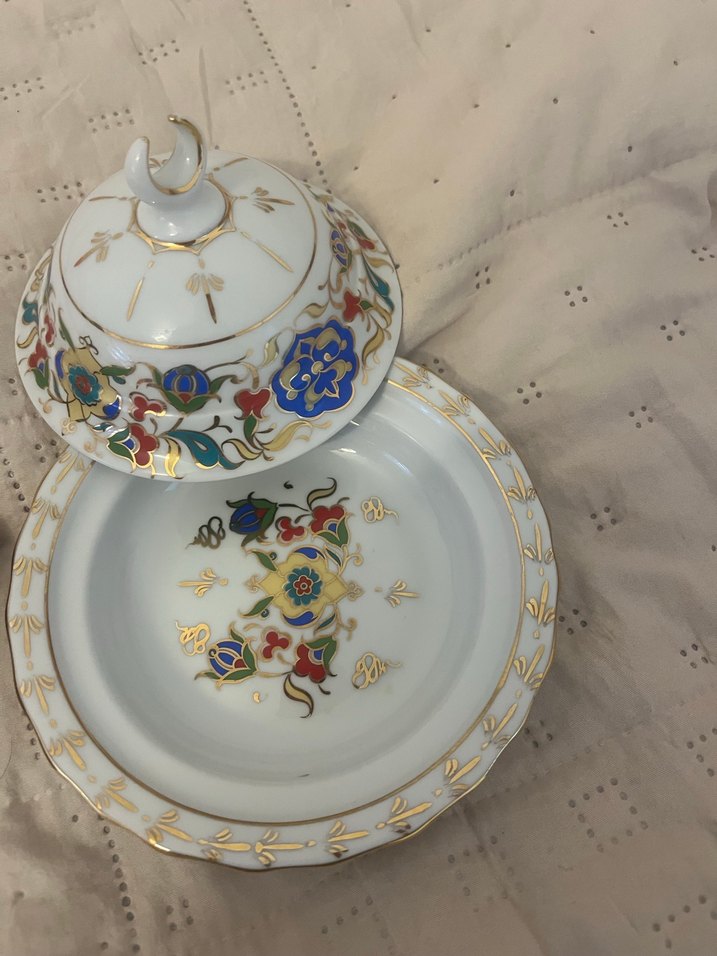 Çiçek desenli ve altın detaylı beyaz porselen lokumluk, kapak ve tabaklıdır. Canlı renkler ve zarif detaylar içerir.