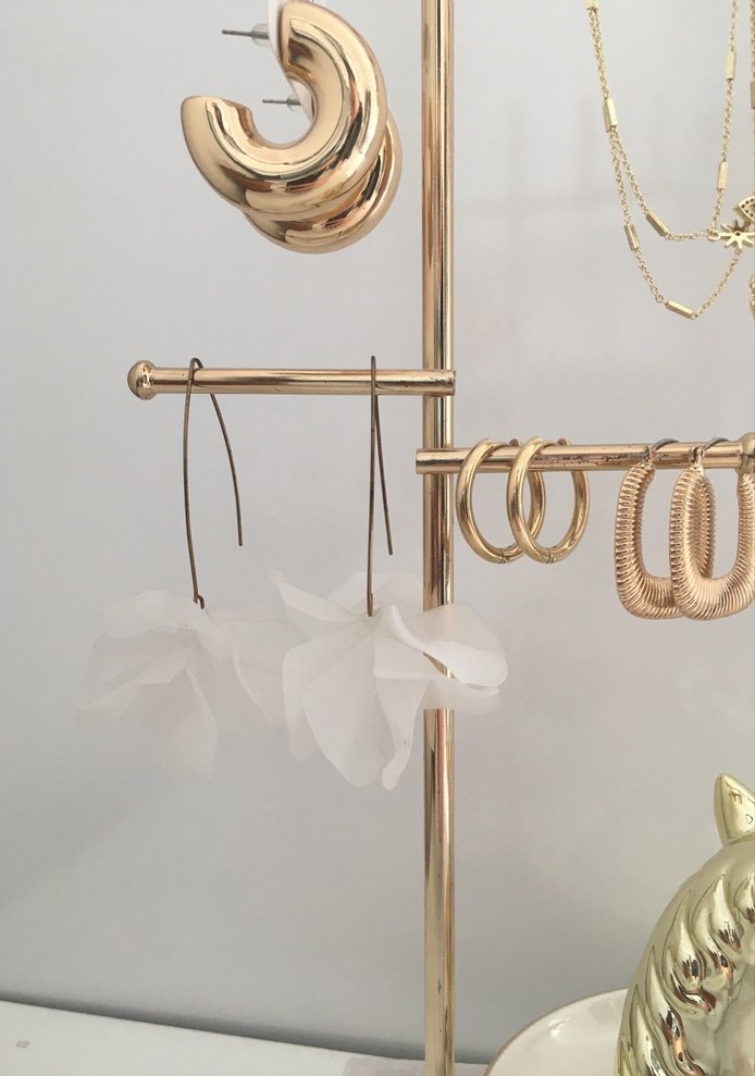 Minimalist ve bohem tarzı birleştiren beyaz çiçekli, püsküllü midi küpe. Düğünler için şık ve trend bir seçim.