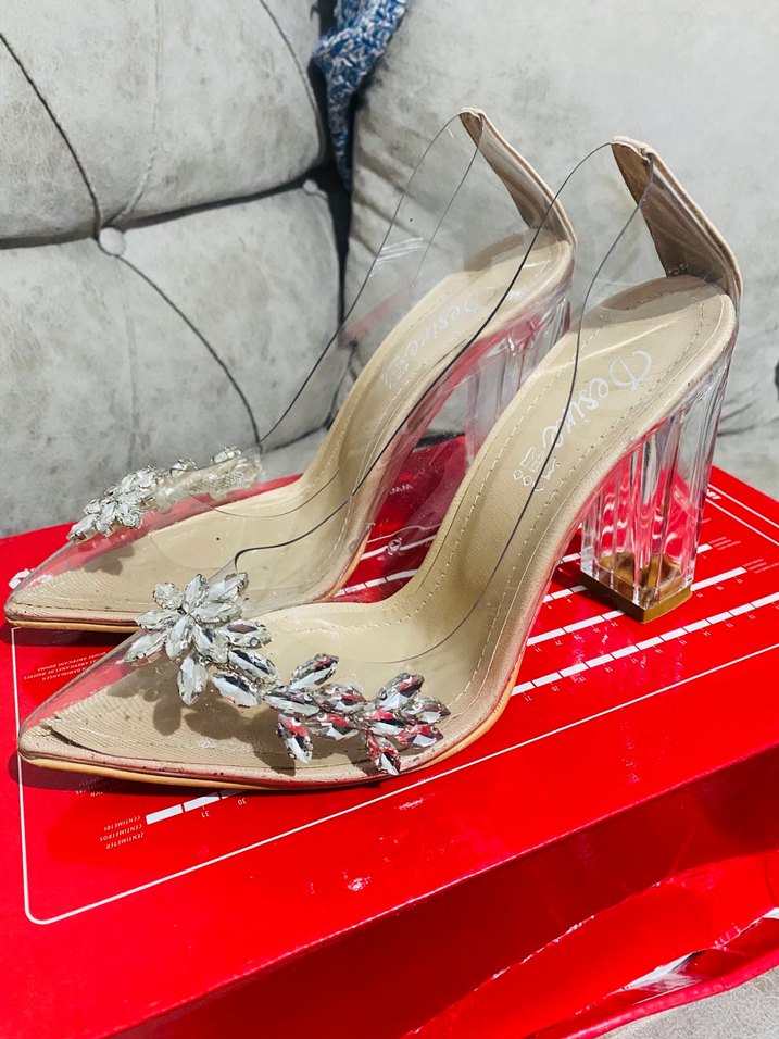 Beyaz renkte, şeffaf cam topuklu abiye ayakkabılar. Ön kısmında çiçek desenli payet süslemeleri bulunur. Düğünler için modern ve klasik bir şıklık sunar.