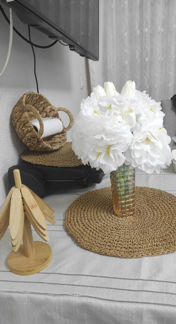 Şeffaf vazoda açık beyaz çiçekler bulunmakta, örgü yuvarlak altlık üzerinde zarif bir dokunuş sağlıyor. çicek istenilen renkte yapilir 2 adet fiyati