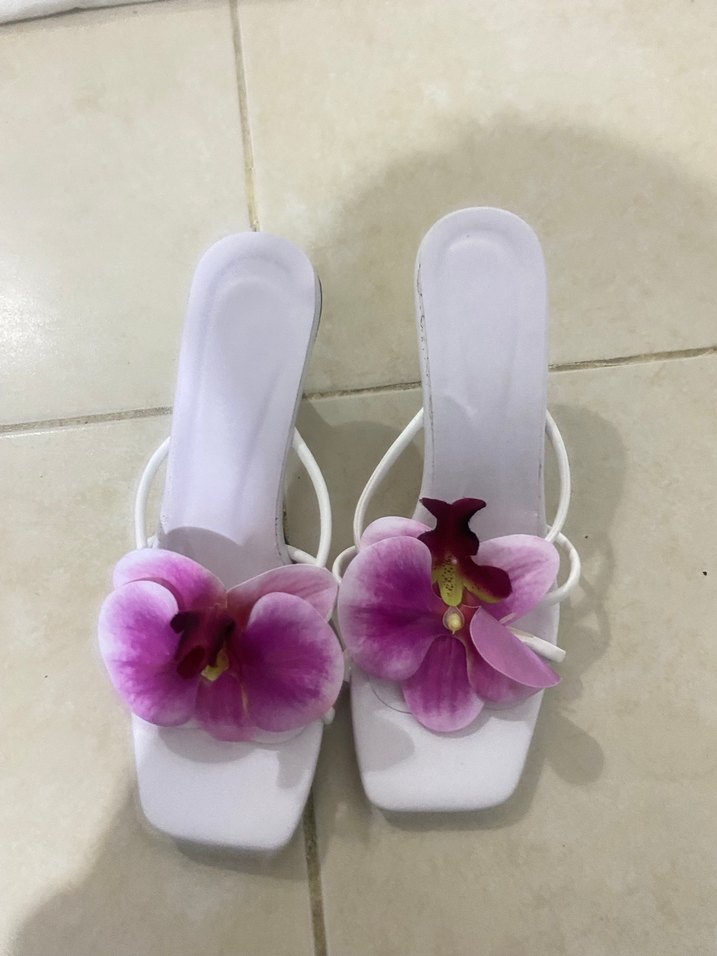 Beyaz, pastel çiçek detaylı, minimal ve çağdaş tasarıma sahip stiletto topuklu kadın terlik. Rahat ve şık görünüm sunar.