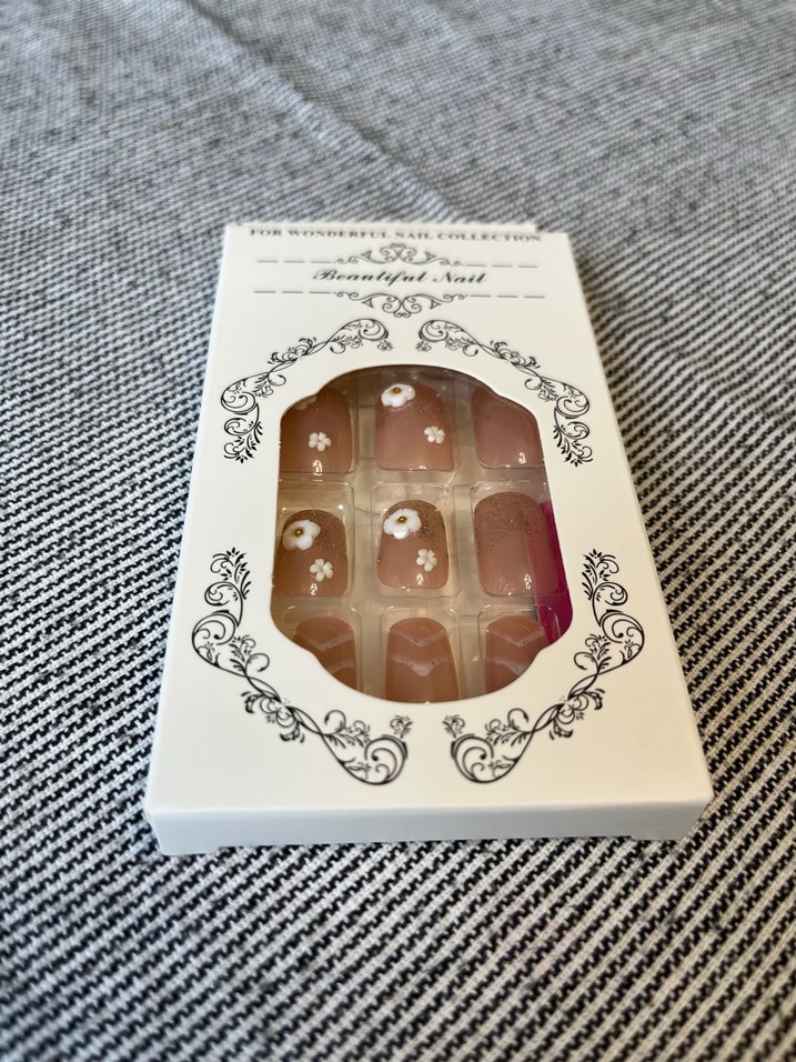 Beyaz çiçek desenli, koyu tonlarda tırnak süslemeleri. Şık ve zarif bir görünüm sunar. Üzerinde Senntifat markası yazılıdır. 24 adet tırnak 24 adet yapıştırıcı bir adet törpü