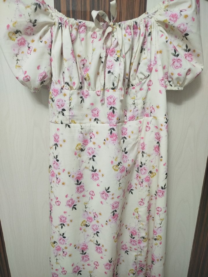 Pastel çiçek desenli, beyaz uzun bol kesim elbise, tekne yaka ve kısa fırfırlı kollu bohem tarzda, günlük kullanım için uygun.