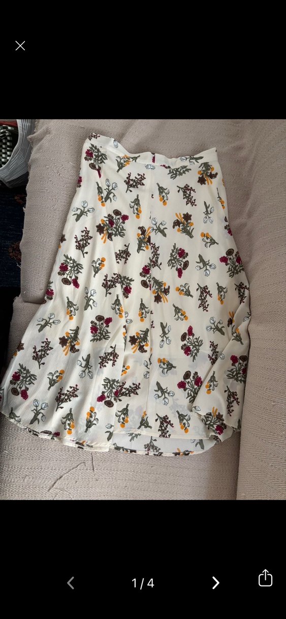 Beyaz renkte, çiçek desenli, bol kesim ve drapeli uzun midi etek. Günlük kullanıma uygun yumuşak sentetik kumaştan üretilmiştir.