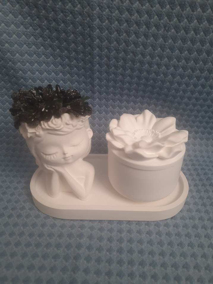 Beyaz renkli, üzerinde figürlü dinlenen yüz ve çiçek şeklinde kapaklı kutu bulunan dekoratif obje.tas tozu ile uretilmistir 3 parca set seklinde go derilecektir.