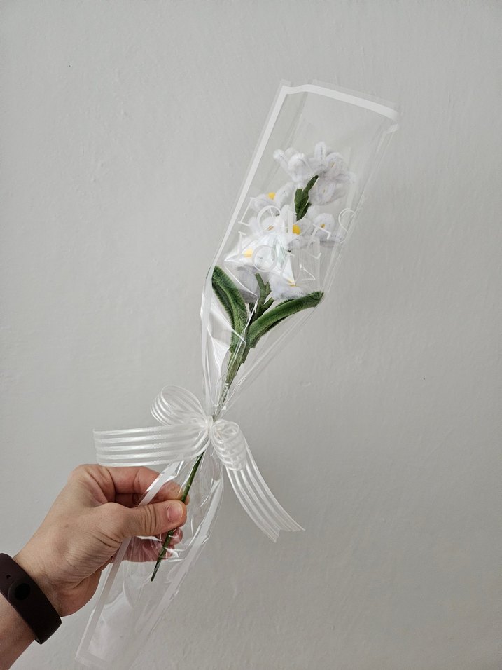 Şeffaf ambalaj içinde beyaz fiyonk ve zarif çiçek detayıyla minimalist buket.