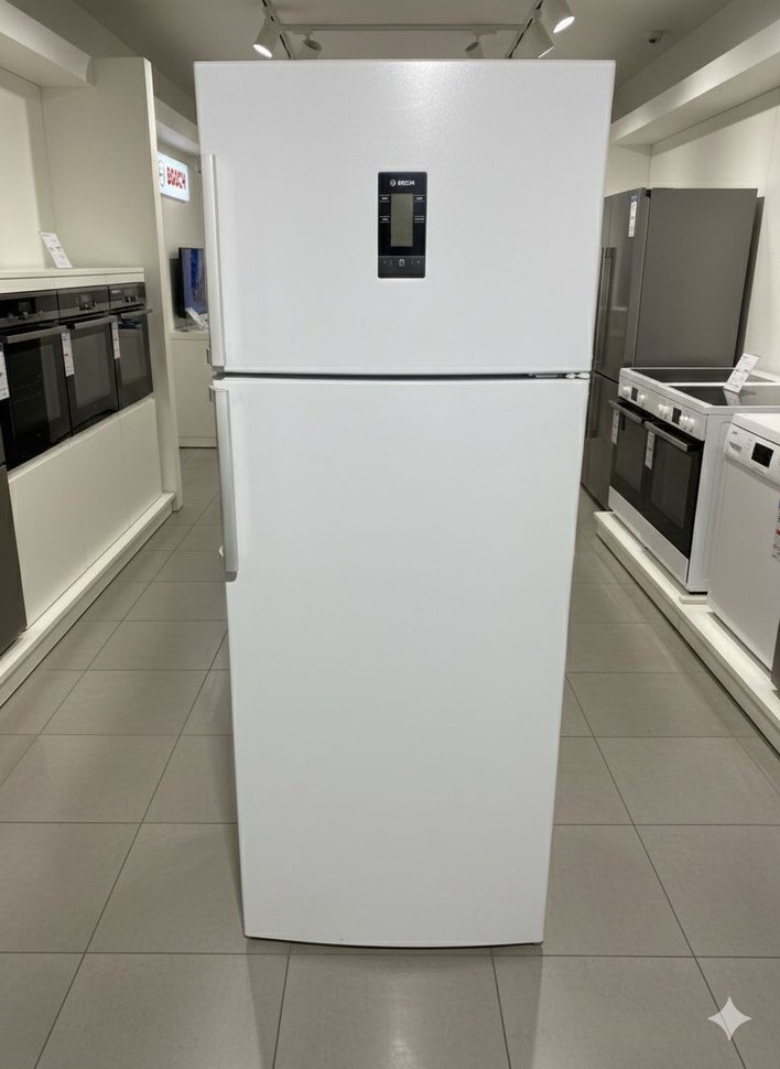 Önünde dijital kontrol paneli bulunan beyaz çift kapılı buzdolabı. Taze ve dondurulmuş ürünler için geniş depolama alanı sunar. ❄️