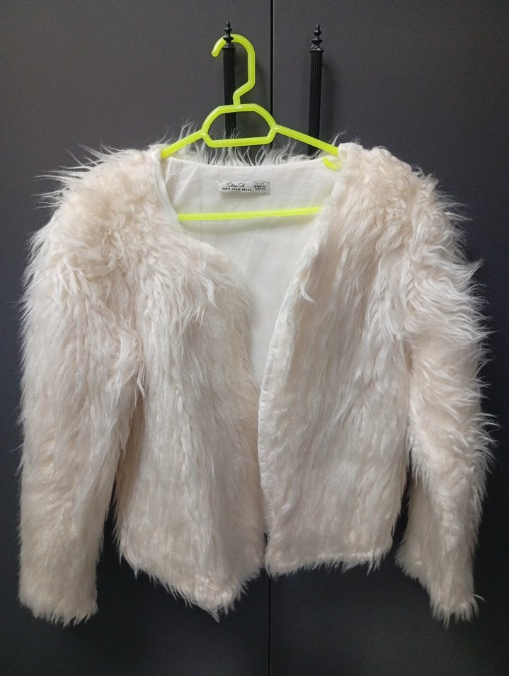 Uzun kollu, fitted kesim ve midi boyda beyaz suni kürk ceket. Yumuşak sentetik kumaştan, günlük sokak modasına uygun rahat bir parça.