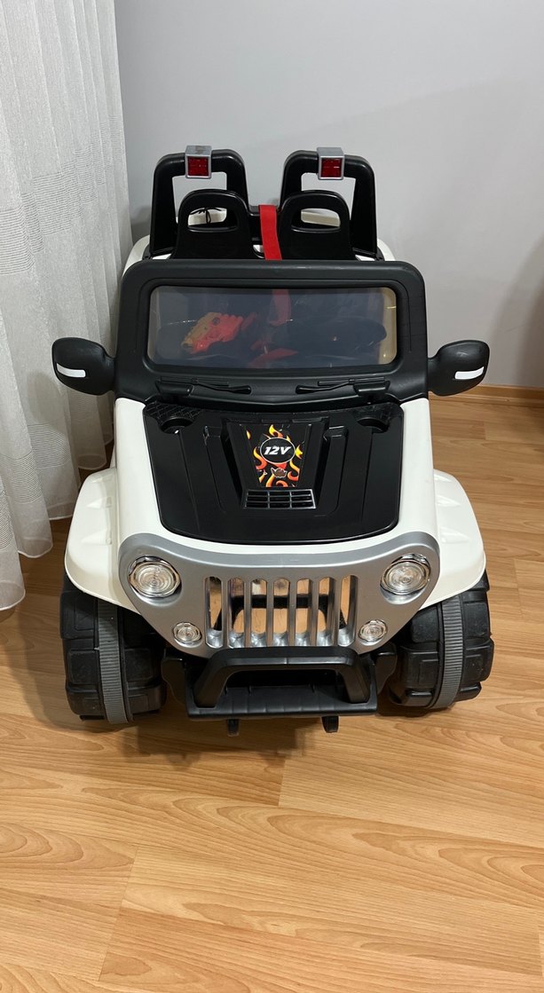 İki kişilik beyaz elektrikli oyuncak araba, sağlam yapılı ve 12V bataryalı. Koyu renk tavan ve gerçekçi ön ızgara detaylarına sahip.