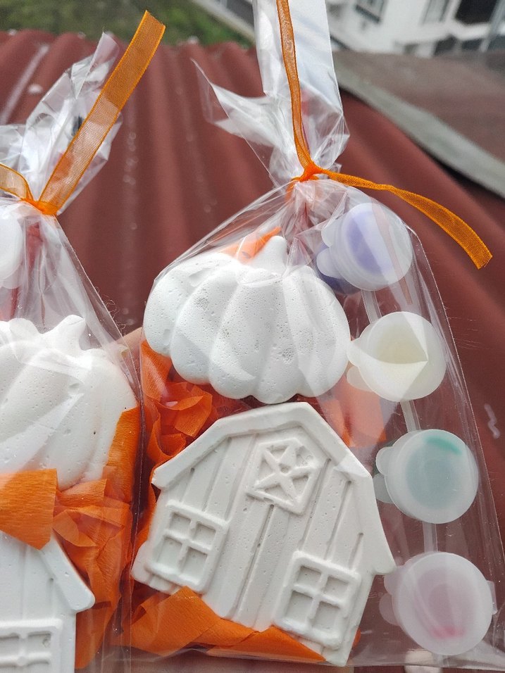 Beyaz ahır ve balkabağı figürleri ile birlikte küçük renkli boyalar içeren, turuncu kurdeleyle bağlanmış parti seti.