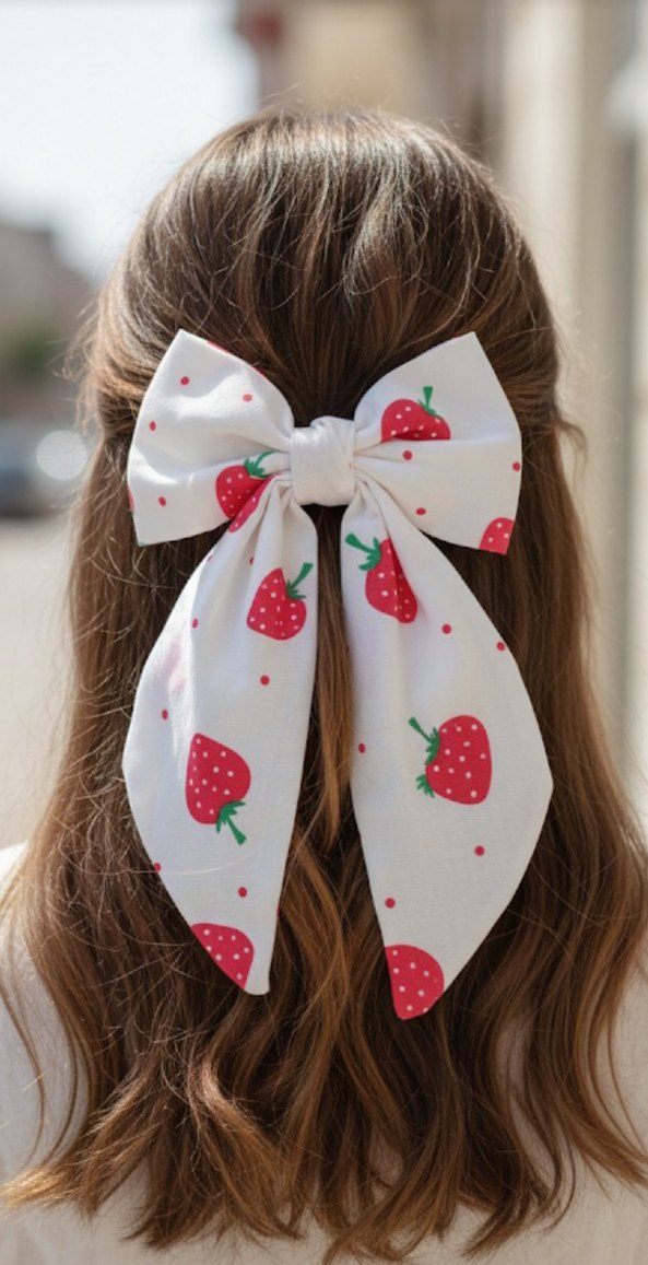 Beyaz Çilek Desenli Fiyonk Saç Aksesuarı