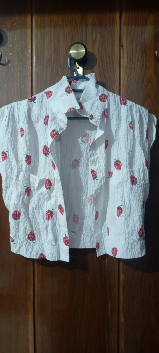 Kolsuz, düğmeli beyaz keten gömlek, çilek desenlidir. Yaka detaylı, rahat midi boy ve bol kesimlidir.