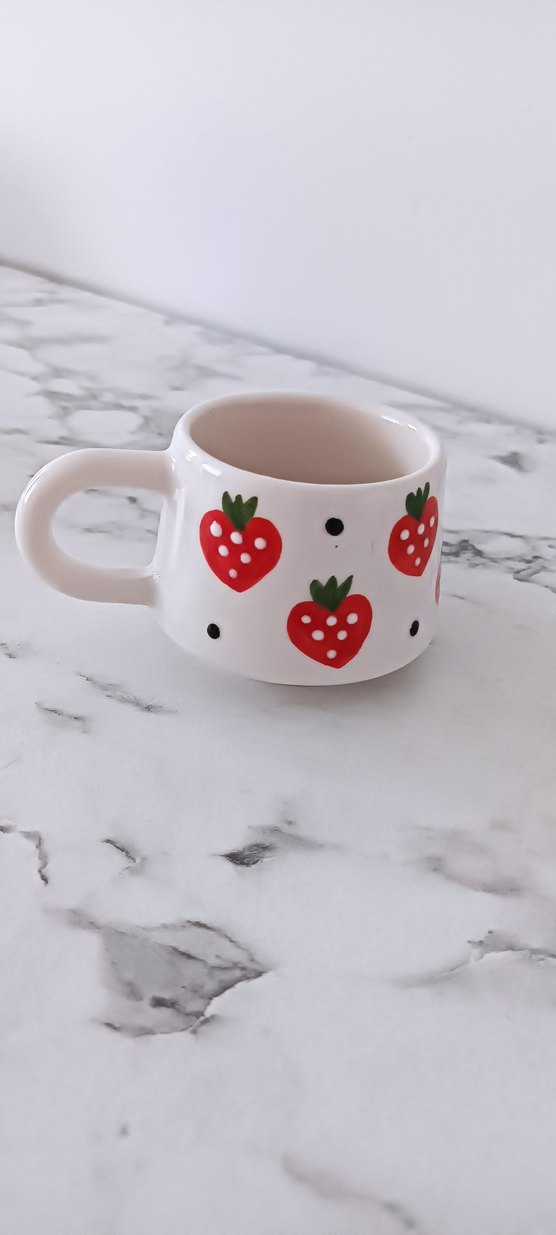 Beyaz seramik kupa, pastel çilek desenleri ve küçük siyah noktalarla süslenmiştir.