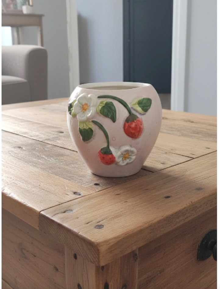 Çilek figürlü vazo.çok iyi durumdadır.ufak tefek kusurları olabilir kırık yeri yoktur.saksı olarakta kullanabilirsiniz boyayıp dönüştürebilirsiniz. marka temsili kullanılmıştır. #vazo #saksı