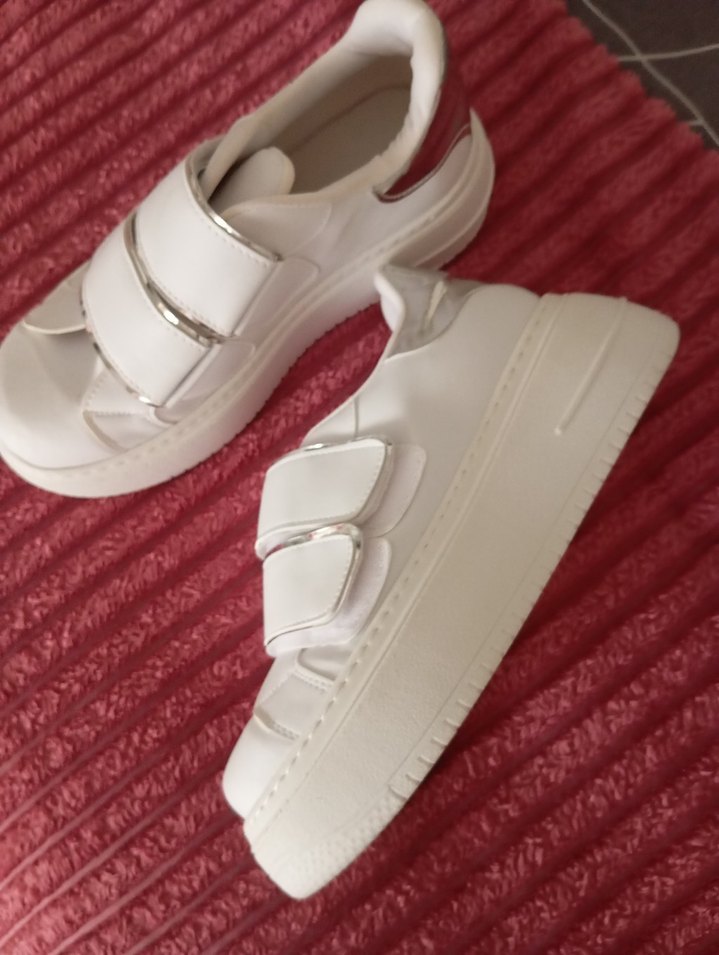 Beyaz, parlak yüzeyli, cırt cırtlı kayışlara sahip dolgu topuklu kadın spor ayakkabısı, kauçuk tabanlı ve şık sokak stiline uygun ürün sıfırdır