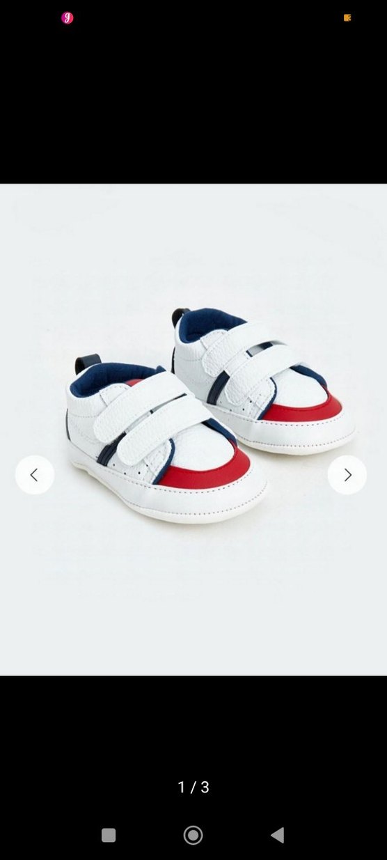 Cırtcırtlı bantlara ve kauçuk tabanlara sahip beyaz erkek bebek ilk adım ayakkabısı, sade sokak stili ile kırmızı ve lacivert detaylar içerir. Hiç bir deformesi yoktur