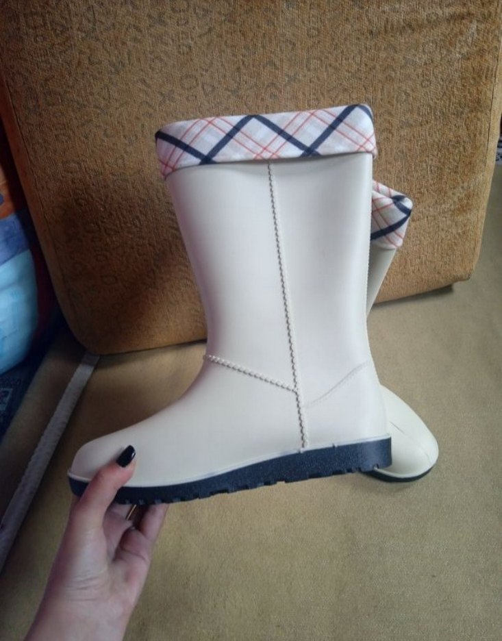Beyaz kauçuk çizme, cırtlı kapanış ve ekose katlanabilir manşet ile rahat sokak stili için uygundur.