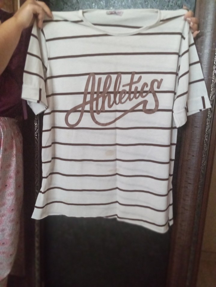 Pamuklu, kısa kollu, yuvarlak yakalı, gri çizgili ve örgü dokulu beyaz tişört. "Athletics" baskılı, rahat kesimli, günlük kullanıma uygun.