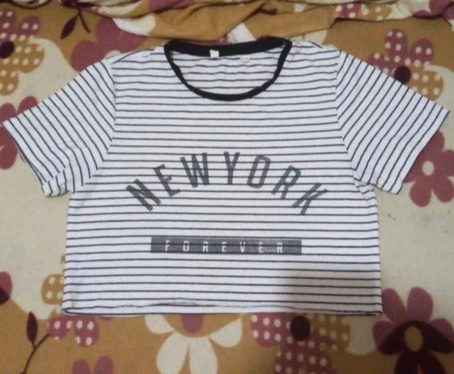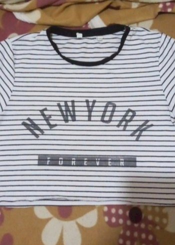 Pamuklu, beyaz siyah çizgili, "NEW YORK FOREVER" baskılı crop top. Kısa kollu, tekne yaka ve vücuda oturan kesime sahip.