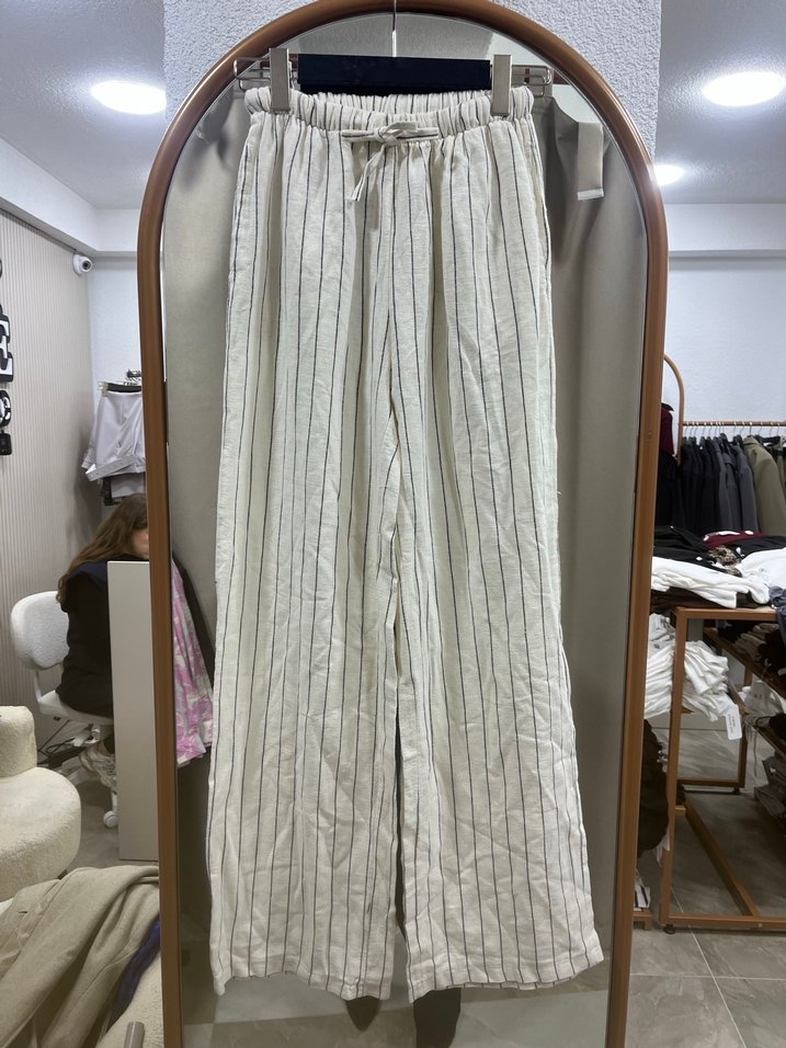 Beyaz Çizgili Bol Kesim Keten Pantolon