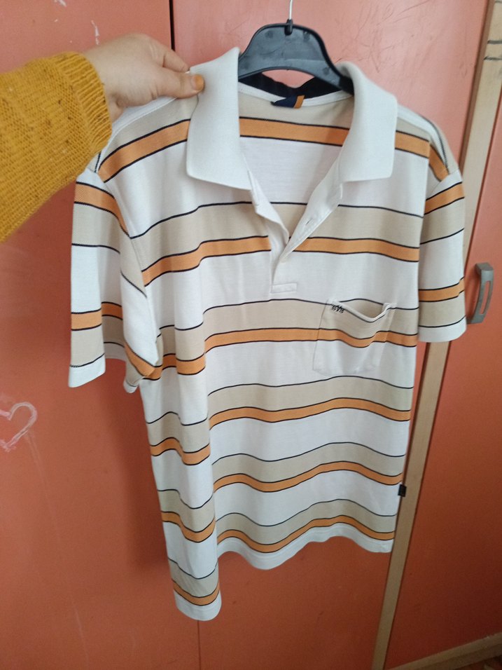 Erkekler için kısa kollu, düğmeli yakalı ve bol kesim beyaz tabanlı, açık kahverengi ve siyah yatay çizgili polo tişört. Yumuşak sentetik kumaştan, günlük rahat stil için uygundur.