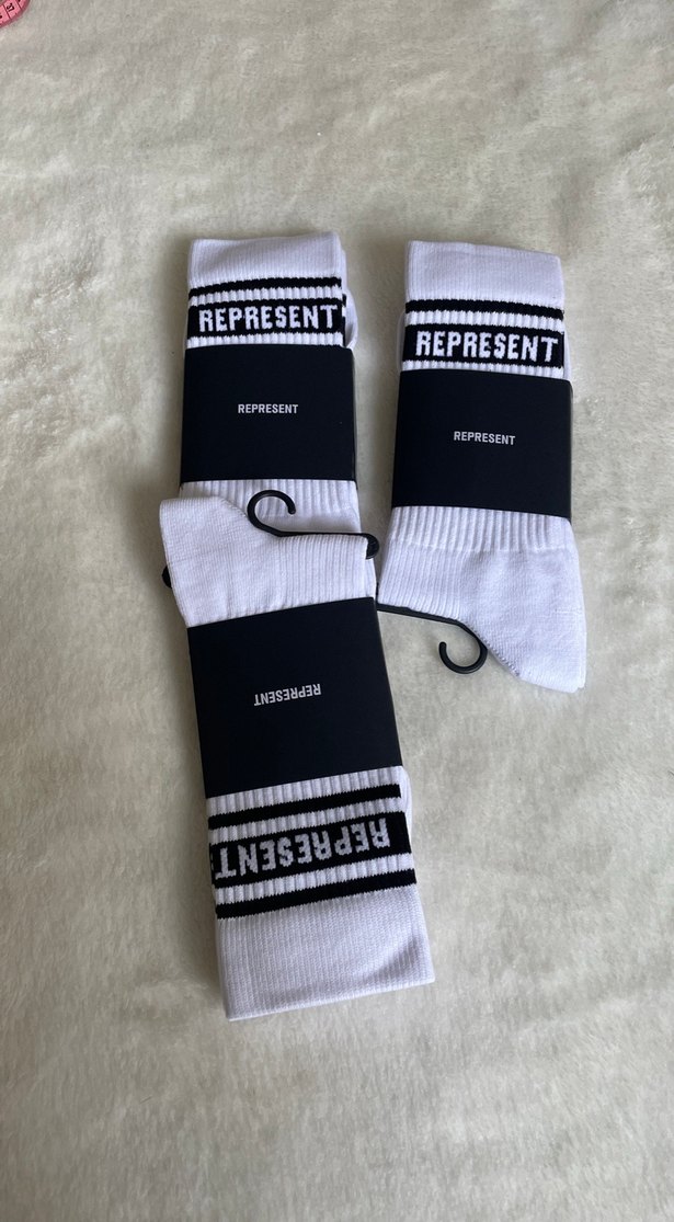Fitted kesimde, beyaz zemin üzerinde koyu renk çizgiler ve 'REPRESENT' yazısı bulunan midi boy erkek spor çorapları.