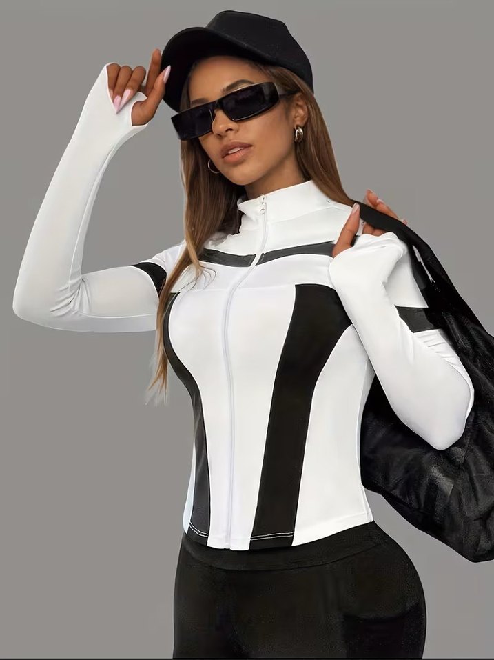Beyaz, yüksek yakalı ve uzun kollu, parmak delikli fermuarlı mini spor üst. Sentetik kumaştan, koyu renk çizgili detaylara sahip, şık ve rahat.