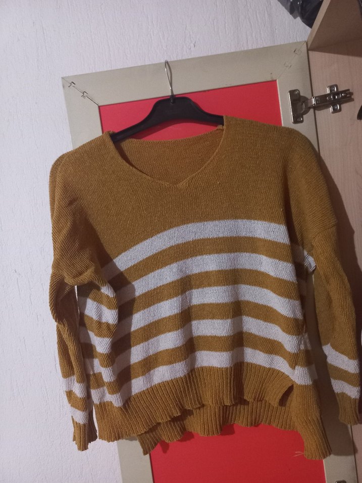 Hardal Sarısı triko kazak, beyaz yatay çizgilerle ve bol kesimle tasarlanmıştır. Uzun kollu ve v yaka, rahat sokak stiline uygundur.