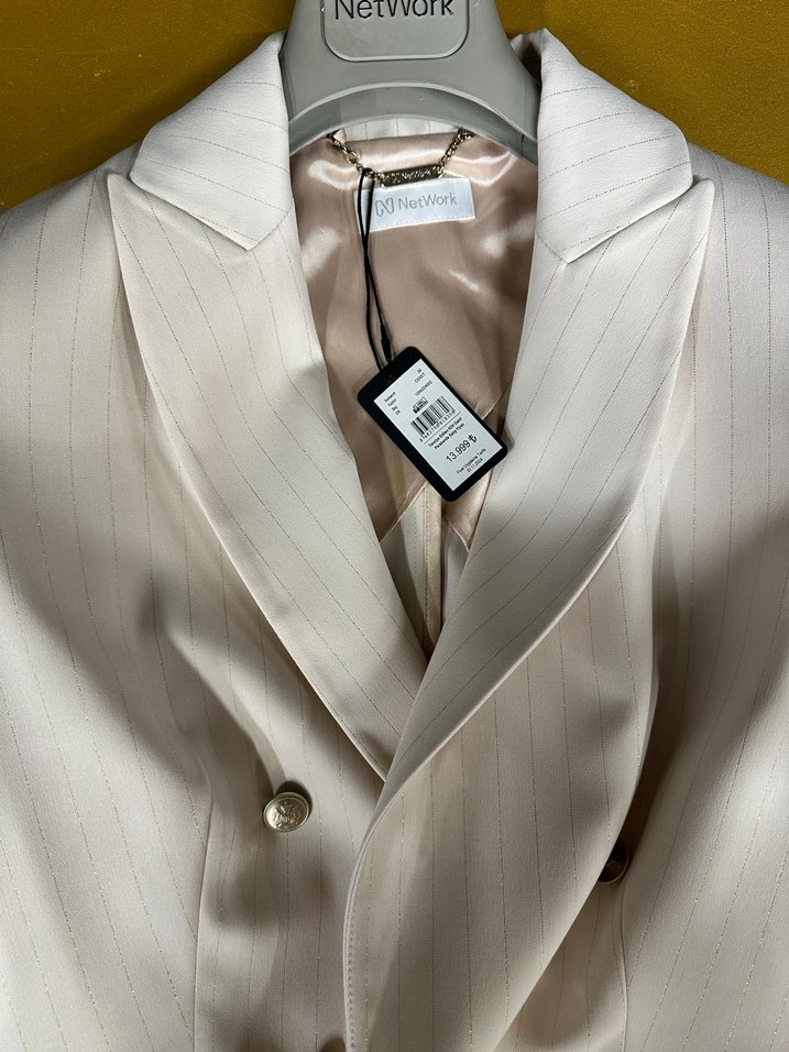 Beyaz renkte, düğmeli ve kesik yakalı kadın takım elbise ceketi. Uzun boy ve çizgili desenle ofis ve sokak stiline uygundur. ✨