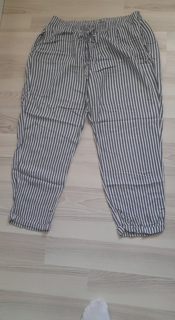 Nefes alan keten kumaştan, kadın pantolon. Çizgili ve rahat ve günlük kullanıma uygun.