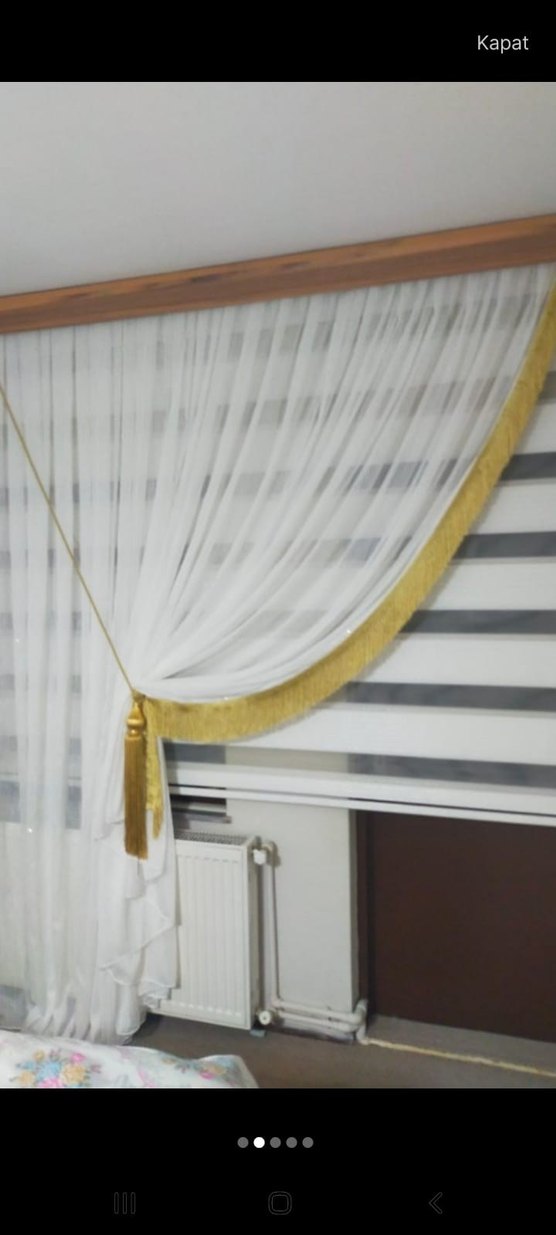 Çizgili desene sahip beyaz konvansiyonel perde, altın renk püskül bağlama detaylı, hafif kumaşla ışık geçirgenliği sağlar.istenilen ölçülerde dikim yapıyorum mt fiyatıdır