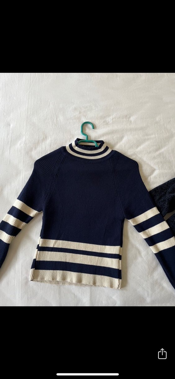 Beyaz Çizgili Lacivert Boğazlı Triko Kazak