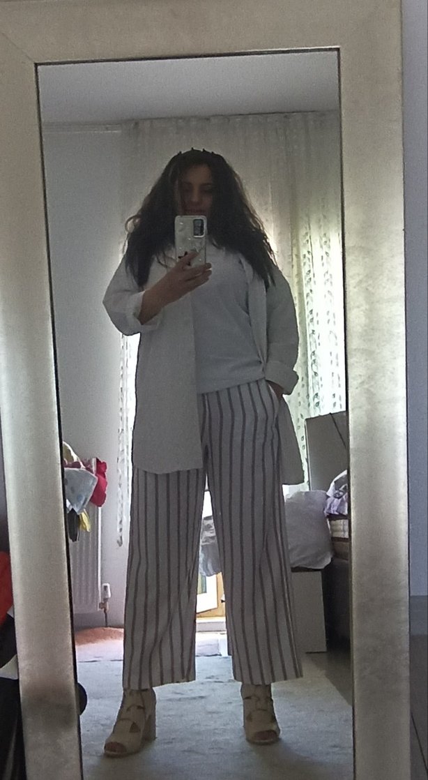 Beyaz, kırmızı çizgili,midi kadın pantolon, yazlık hava aldıran harika bir kumaştan, rahat kesimli, günlük sokak stili için uygundur. Sıfır hiç giyilmedi Dar geldiği için satıyorum. Modeli kesimi kumaşı mükemmel tam yazlık...36 beden ama arkası lastikli 38 beden de giyebilir.