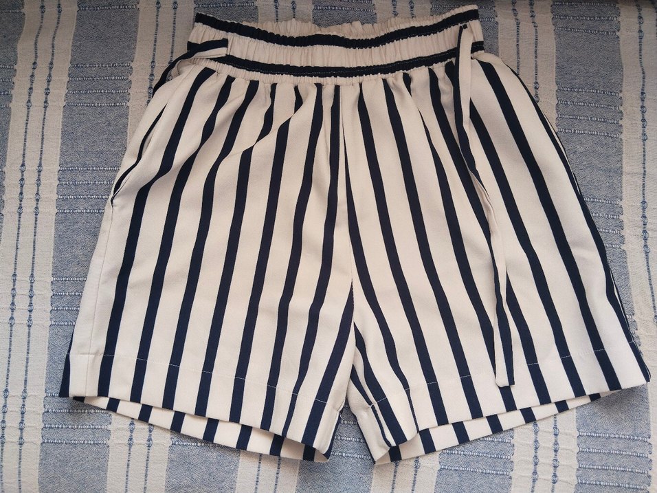 Beyaz ve siyah dikey çizgili, pileli ve bol kesim mini şort. Yumuşak sentetik kumaştan, rahat günlük sokak stili için uygundur.