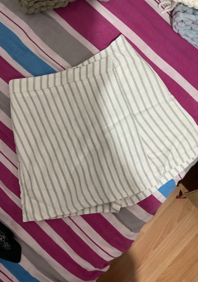 Sentetik kumaştan yapılmış, beyaz çizgili, pilili ve bol kesim mini etek. Bir kez giyildi