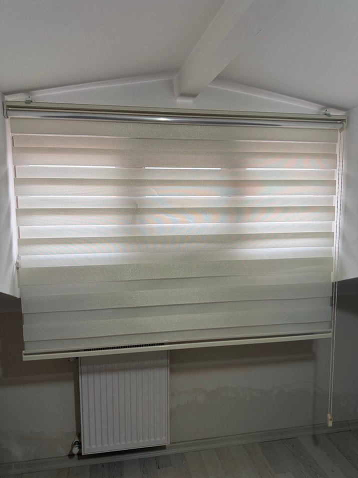 Beyaz çizgili zebra perde, şeffaf ve opak kumaş şeritleriyle ışık ayarı sağlar. Modern ve şık tasarıma sahiptir. Temiz kullanıldı fakat birkaç yerinde yırtık bulunuyor,yine de iş görür,ölçüleri:genişlik 1,44 mt,boy 1.07 mt