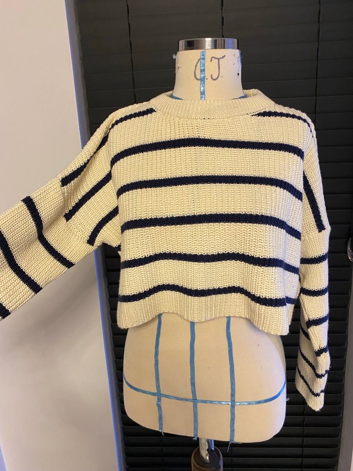 Quzu marka deformasyonu yoktur. Ürün krem rengidir üstündeki çizgiler lacivert kısa kazak uzun kollu, yuvarlak yakalı ve bol kesim örgü kazak. Midi boyda, günlük kullanım için uygundur.