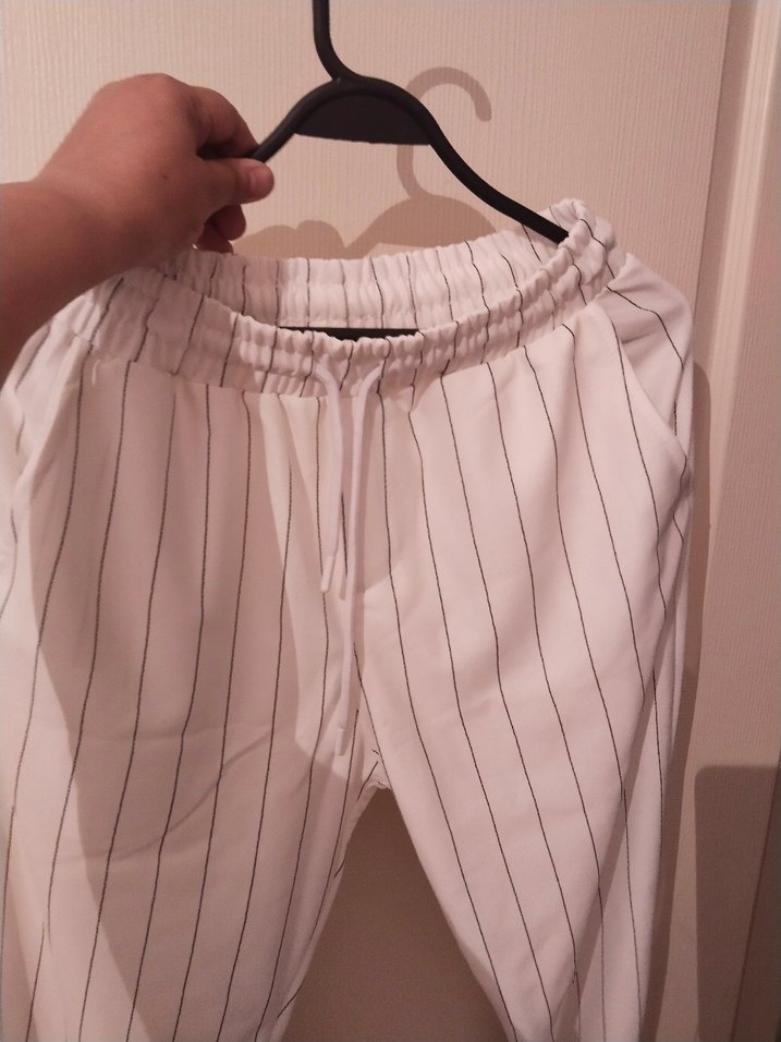 Beyaz, çizgili ve pilili erkek pamuklu kumaş pantolon, bol kesim ve midi boyda, hafif sentetik kumaştan üretilmiştir.