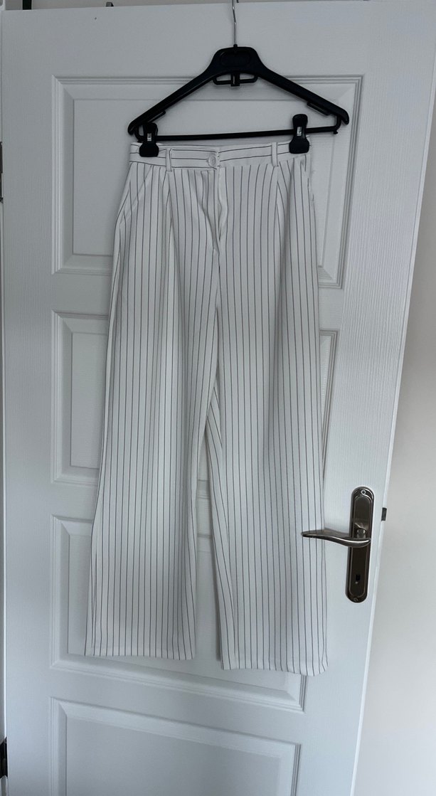 Beyaz Çizgili Pilili Kadın Kumaş Pantolon