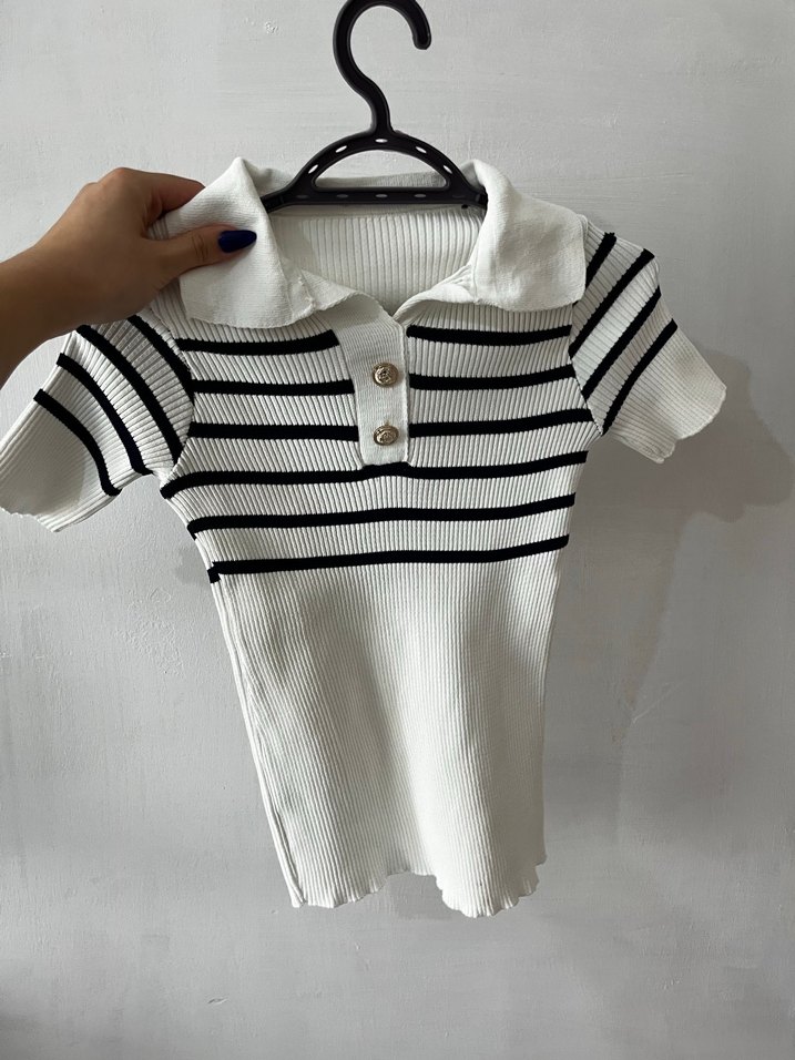 için kısa kollu, düğmeli, yakalı ve fitted kesim beyaz-zebra desenli örgü polo tişört. Trendy sokak stiline uygundur.