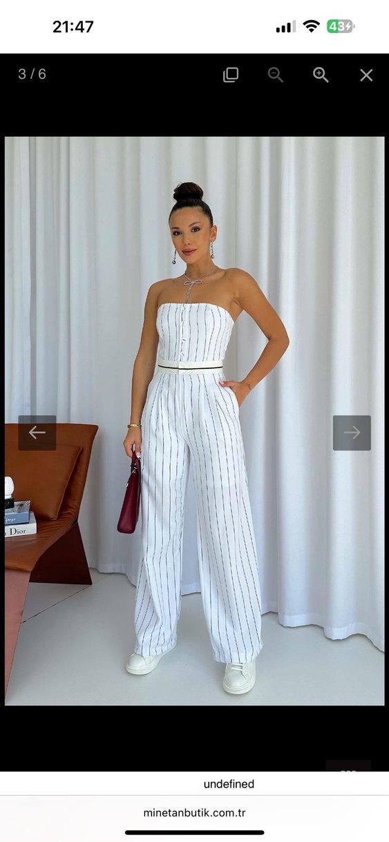 Beyaz çizgili, straplez ve ince askılı, kemerli bel detaylı pamuklu tulum. Regular fit ve uzun paça, günlük rahat şıklık için ideal.