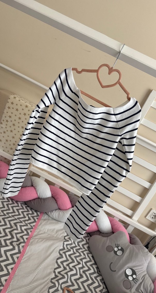 Kız çocuklar için uzun kollu, tekne yaka ve çizgili desenli beyaz triko bluz. Rahat ve şık sokak stiline uygun.