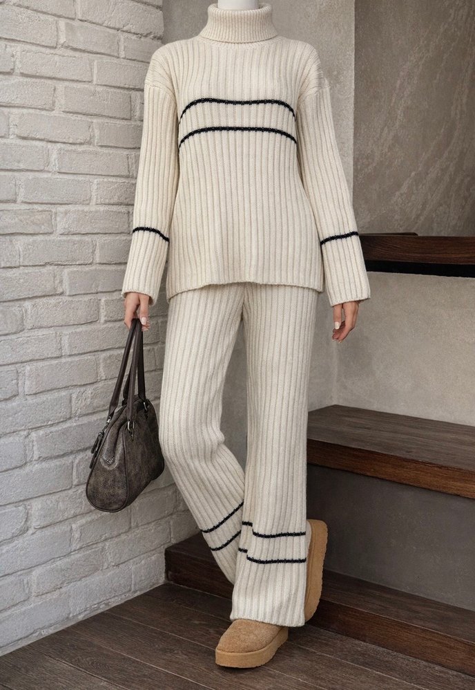 Beyaz triko midi elbise, boğazlı yaka ve askılı kollarla, gri çizgilerle detaylandırılmış, rahat kesimiyle günlük kullanıma uygundur.