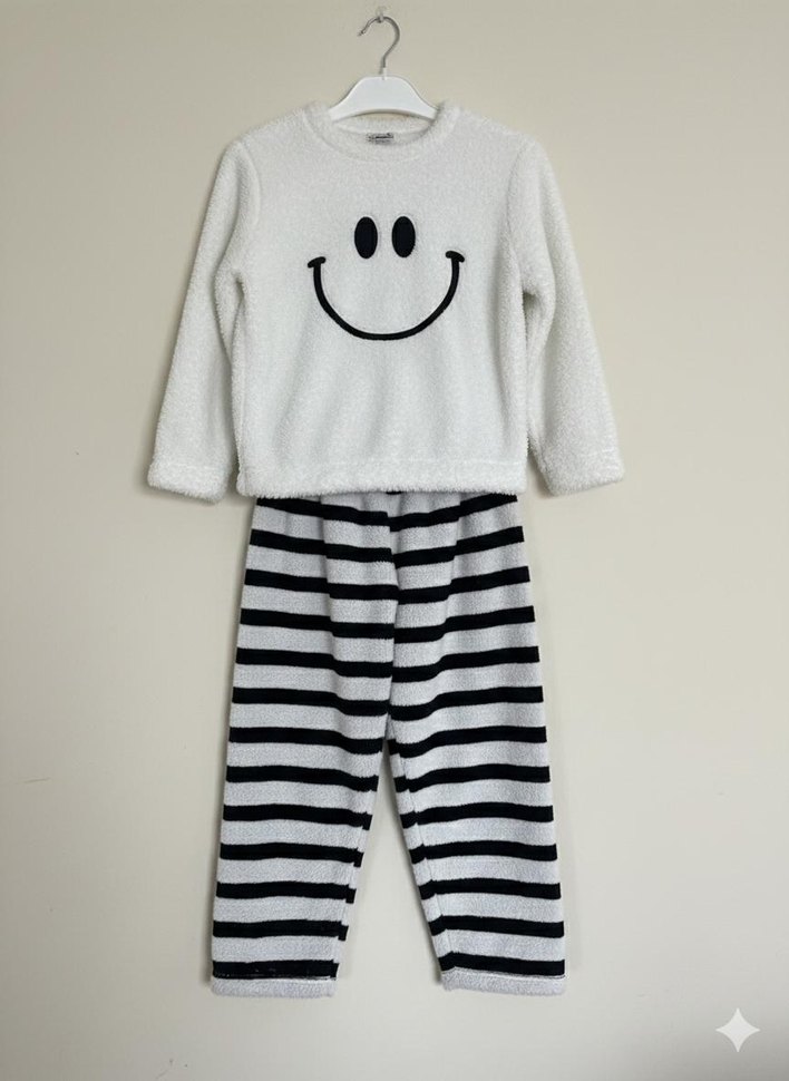Yumuşak dokulu, beyaz örgü polar üstü gülen yüz baskılı, uzun kollu ve bol kesim çizgili pantolonlu pelus takim