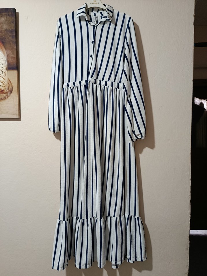Beyaz renkli, çizgili ve pileli detaylı uzun elbise. Salaş kesim, tekne yakalı ve askılı kolludur. Yumuşak sentetik kumaştan üretilmiştir.