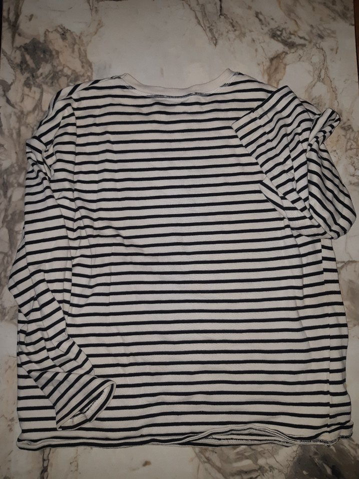 Kızlar için ince keten kumaştan, uzun kollu, yuvarlak yaka, gri çizgili ve fırfır detaylı bol kesim bluz.yakasinda biraz sararma var fiyata yansımıştır .XL beden ama L de çok sırıtmaz