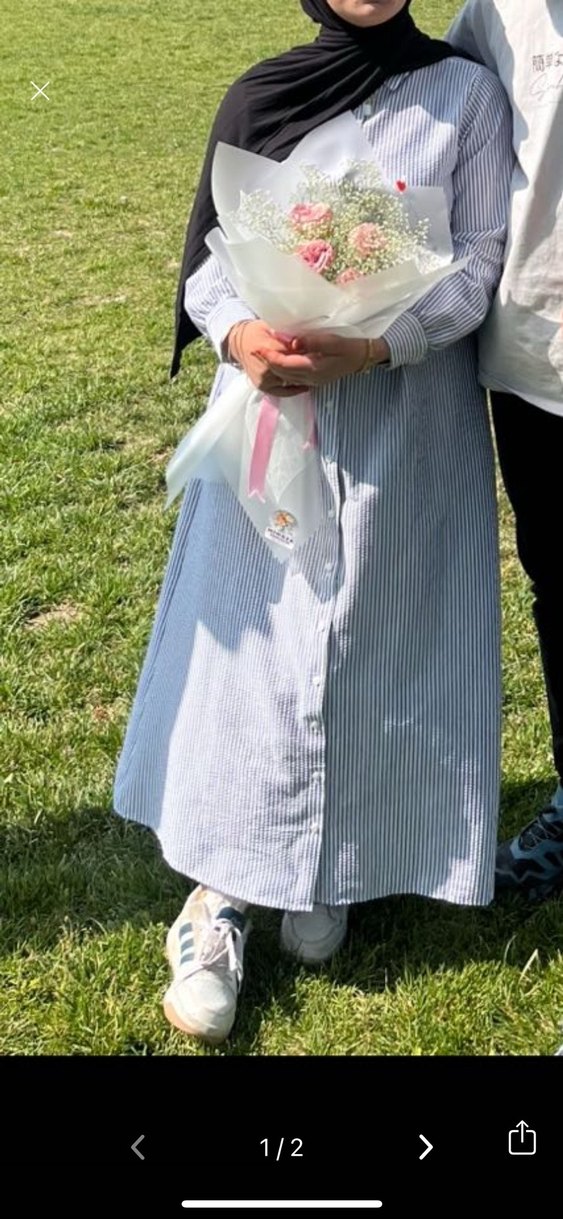 Beyaz çizgili midi uzun kollu elbise, rahat kesim ve kesik yaka detayıyla. Hafif sentetik kumaştan, günlük sokak stili için uygundur.