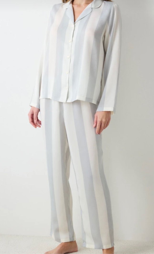 Kadın pijama takımı, regular fit, uzun kollu ve midi boydadır. Pastel beyaz çizgili minimal ve normcore tarzda rahat bir tasarıma sahiptir.
